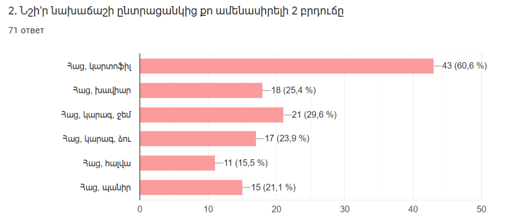 Մասնակիցների մի մասն էլ առաջարկում է ճաշացանկում ավելացնել՝ ձու, ապուրներ, թխվածքաբլիթներ, մեղրով բրթուճներ, պիցցա, աղցանների տեսականին ավելացվեր, տաք թեյ, շոկոլադ, մրգեր, նուտելայով բրդուճ։